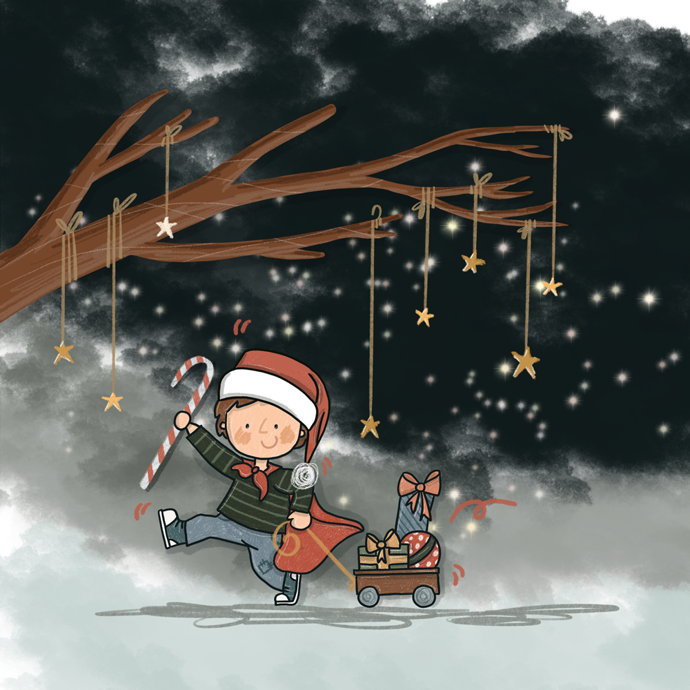 Dit vrolijke mannetje, verkleed als kerstman, is onderweg om cadeautjes te bezorgen!
